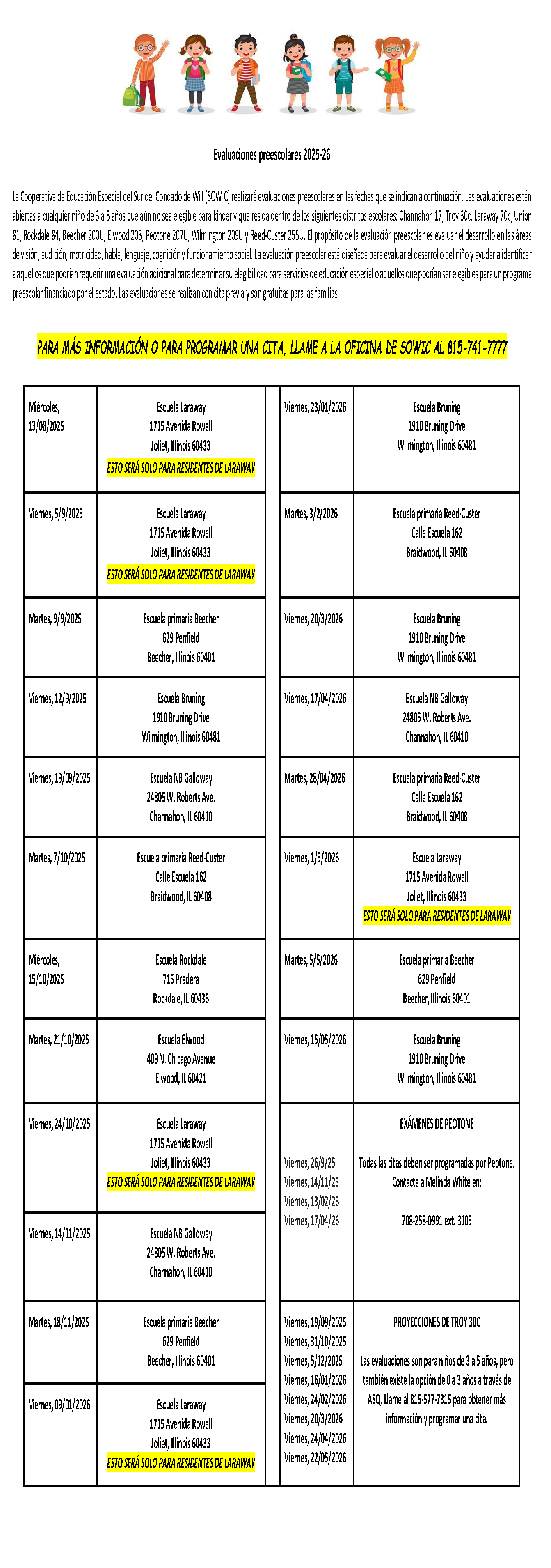 Southern Will County Cooperative for Special Education (SOWIC) will be conducting preschool screenings on the dates listed below. The screenings are open to any 3-5 year old child, not yet eligible for kindergarten, residing within the following school district boundaries: Channahon 17, Troy 30C, Laraway 70C, Union 81, Rockdale 84, Beecher 200U, Elwood 203, Peotone 207U, Wilmington 209U, and Reed-Custer 255U. The purpose of the preschool screening is to assess development in the areas of vision, hearing, motor, speech, language, cognition and social functioning. The preschool screening is designed to assess a child’s development and assist in identifying children who may require further evaluation to determine eligibility for special education services or those who may be eligible for a state-funded preschool program. The screenings are by appointment, and are provided at no cost to families.